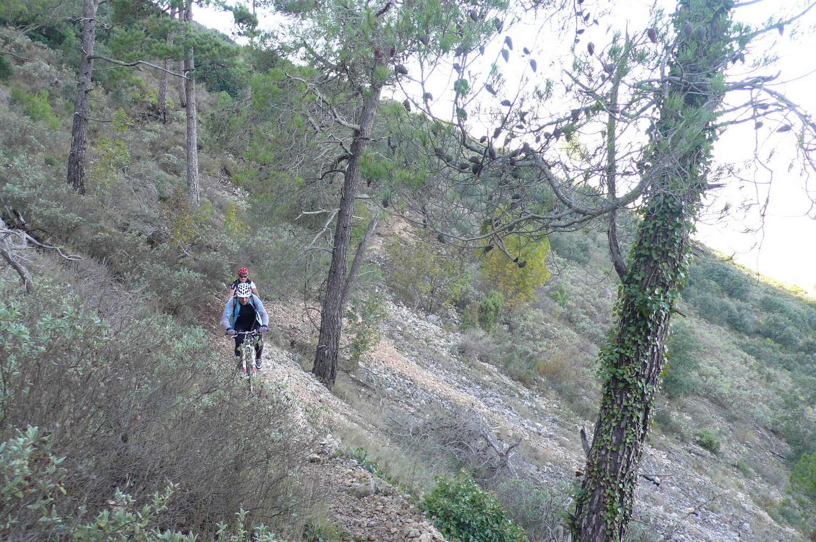 Continuamos el ascenso, tomamos algunos desvios varios y llegamos a las ruinas de la casa y cava de Diego (a partir de aqui nos unimos al recorrido de nuestra anterior visita). Seguimos ascendiendo por la pista y, cuando ésta acaba, continuamos por un sendero a media ladera. Este sendero, húmedo por las recientes lluvias y a ratos cerrado por la vegetación, nos obliga a empujar la bici y poner pie a tierra en más ocasiones de las que recordaba. El sendero, con tramos aéreos, es un auténtico balcón natural que nos regala impresionantes vistas de la Vall d'Albaida.Ascendemos, zizzagueando y empujando, hasta que alcanzamos un collado. Aquí, el sendero, más abierto entre la vegetación, nos permite pedalear hasta que, después de tomar un desvío, alcanzamos la impresionante cava del Benicadell.